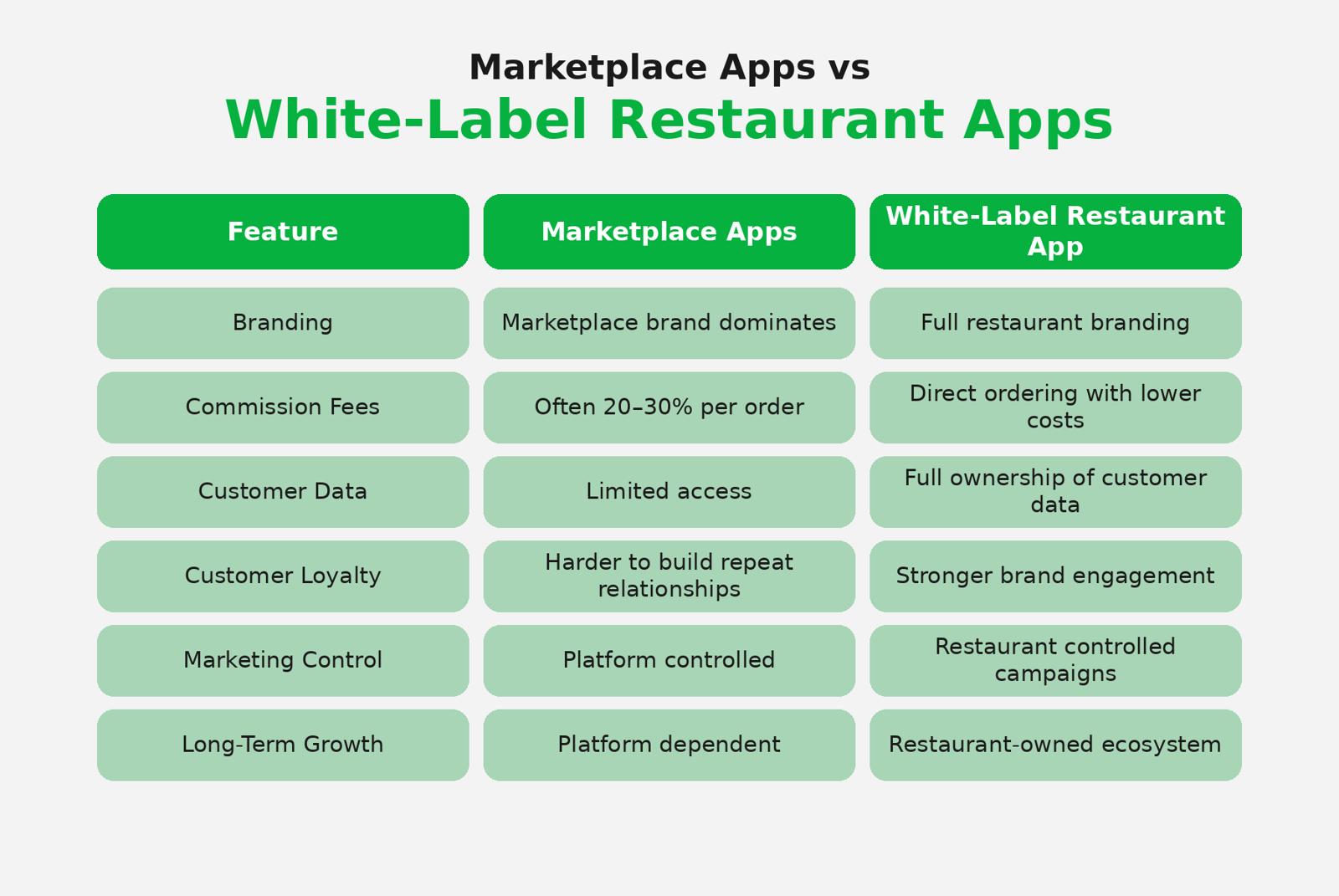 Restaurants use white label apps to reduce marketplace commissions, own their customer data, and create direct ordering channels.